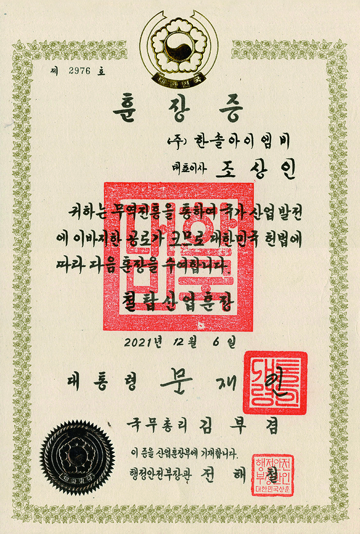 In Daegu Metropolitan City, along with Kolon Fiber Co., Ltd., which won the Order of Industrial Service Merit, Hansol IMB's CEO Jo Sang-in was the only one to win the Order of Industrial Service Merit and the $7 million Export Tower.